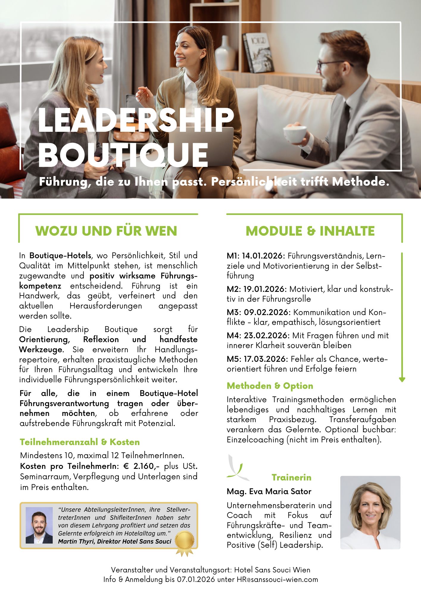 Für alle, die in einem Boutique-Hotel Führungsverantwortung tragen oder übernehmen möchten, ob erfahrene oder aufstrebende Führungskraft mit Potenzial.