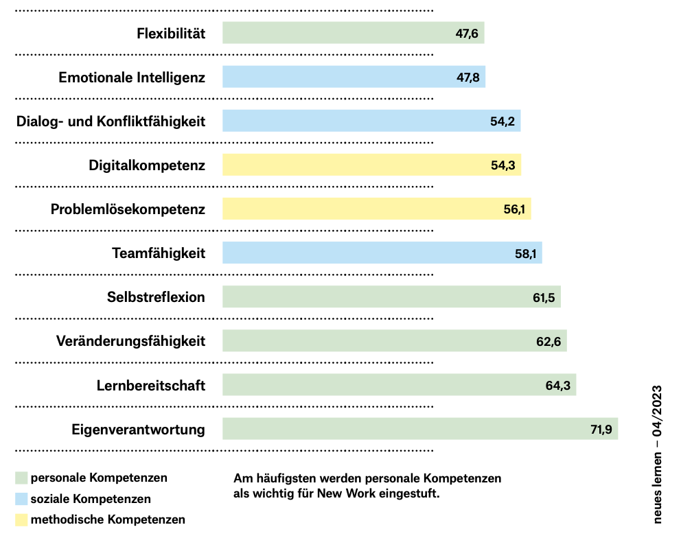 In der jährlichen Online-Befragung der SRH Berlin University of Applied Sciences (Institute für New Work and Coaching) wurden 2023 knapp über 600 UnternehmensvertreterInnen befragt, welche Fähigkeiten aus ihrer Sicht für New Work notwendig sind.